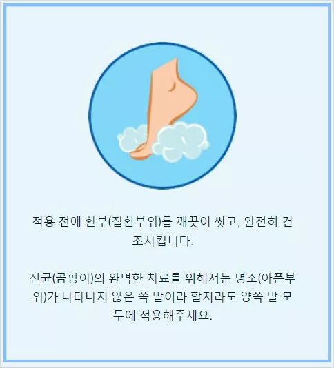 • 사용 후 관리: 제품을 바른 후 최소 24시간 동안 발을 물에 닿지 않도록 하고, 샤워나 수영 등을 피하십시오.